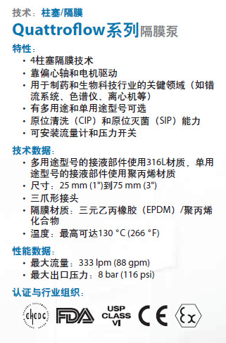 uattroflow的產品需要主要供應于密封性好、純度高、無菌的制藥業(yè)和生物技術產業(yè)。Quattroflow的容積式泵產品采用無機械密封的四活塞隔膜技術,該泵由一個偏心軸桿及發(fā)動機驅動。