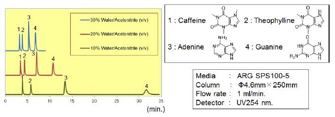 圖1 使用ARG硅膠,在HILIC模式下,水的含量對保留時間的影響