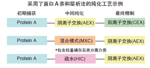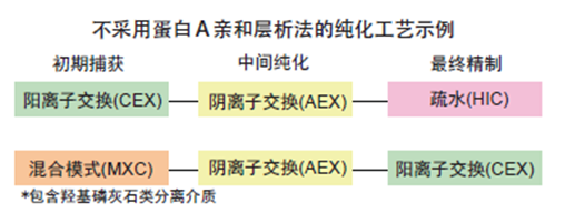 ??? 不采用蛋白A親和層析法的純化工藝可降低工藝成本。可通過結合使用陽離子交換層析法 ( CEX ) 、陰離子交換 層析法 ( AEX )、疏水相互作用層析法 ( HIC ) 以及混合模式層析法 ( MXC ) 實現(xiàn)對單抗的高純度純化制備。