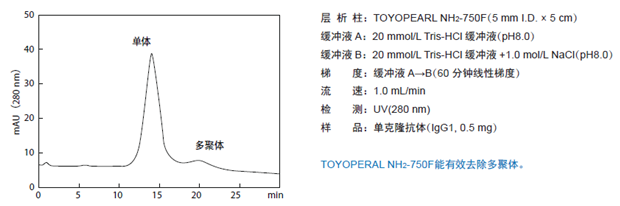 ????陰離子交換填料在抗體的純化工藝中一般通過流穿模式來去除樣品中的宿主細胞蛋白、核酸、內(nèi)毒素、多聚體等雜質(zhì)。? TOYOPEARL GigaCap Q-650MTOYOPEARL Q-600C ARTOYOPEARL NH2 -750F 等,均是高載量型的優(yōu)異層析填料。