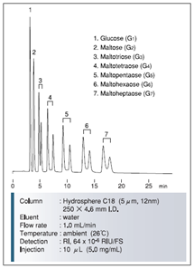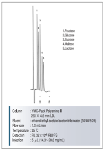 迄今為止,大多數糖類的分離介質僅僅局限在分析級別,但是富士硅膠研發出用于制備色譜的新的氨基硅膠。當使用高水相為流動相時,一般的氨基填料會暴露出很多問題。氨基硅膠的pH值很高,一般pH為9.0,在這樣高的pH條件下,目標化合物一般都會變性,并且會毀壞硅膠基質的表面。考慮到這些問題,富士公司研發出新的氨基硅膠填料,稱之為NH SG硅膠。NH SG硅膠可以最小化甚至是避免上述問題,并且對糖類化合物進行更好的分離。