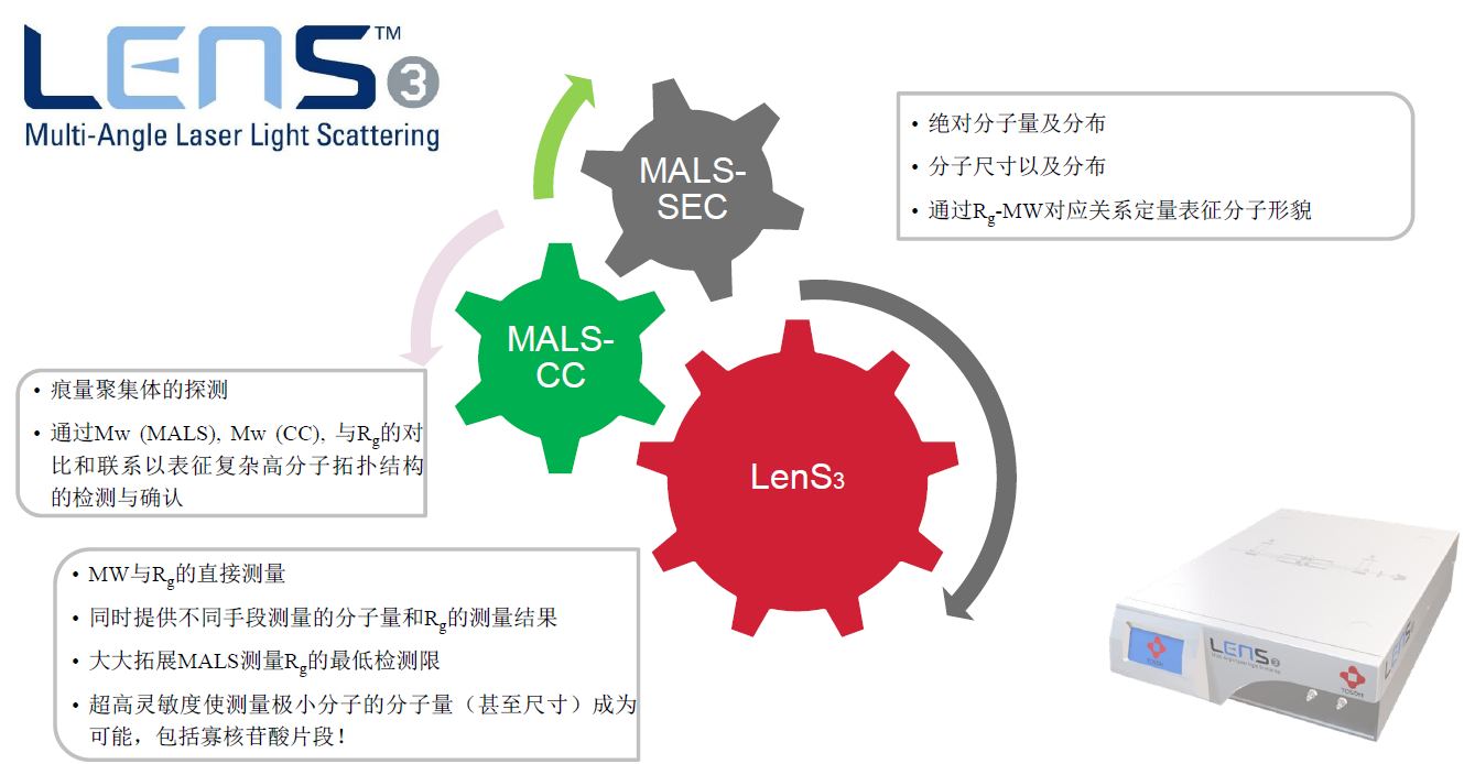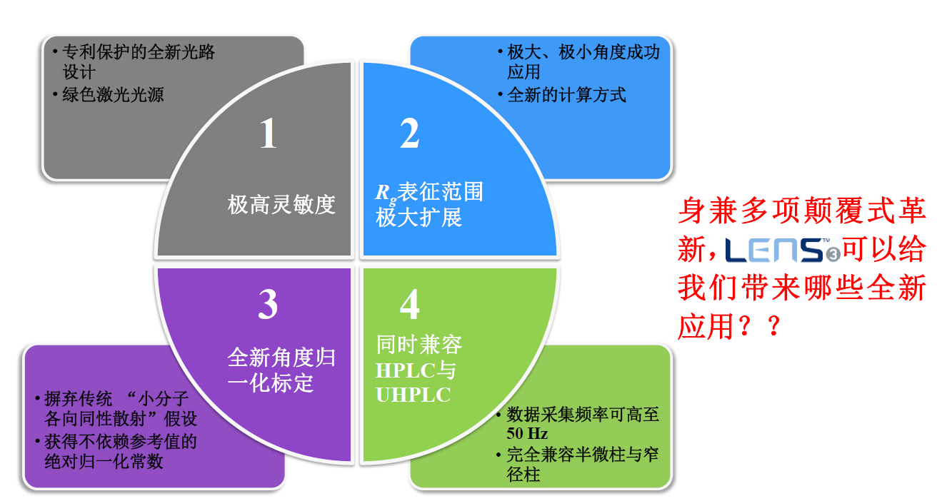 相較于自上世紀(jì)80年固有的光散射技術(shù),東曹推出的LenS3光散射采用全新設(shè)計(jì)概念,完美集成的一個極小角度(10°的LALS),一個極大角度(170° High Angle Light Scattering, HALS),和一個直角度(90°的RALS),從而達(dá)到: