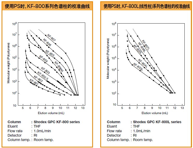 GPC KF-803L是標準的油溶性SEC色譜柱,適用于從低分子量到高分子量的寬范圍的樣品。GPC KF-803L色譜柱是適合分子量分布廣的樣品的混合填料色譜柱。流動相是THF。