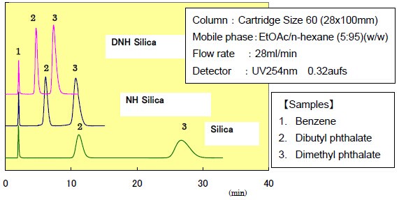 ? ?DNH硅膠鍵合的二元胺和一元胺是NH硅膠的2倍。基于這個原因,DNH硅膠的堿度要比NH硅膠強,并且由于碳鏈較長,DNH硅膠的氫鍵作用要比NH硅膠弱一些。因此,DNH硅膠的流動相要選擇極性小的溶劑,因為DNH硅膠的洗脫速度要比普通的裸硅膠和NH硅膠快。