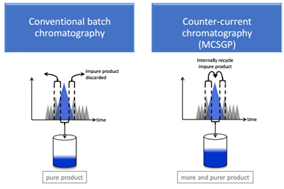 圖1. 傳統(tǒng)單柱層析(左):重疊組分被舍棄;MCSGP(右):重疊組分被在線回收,再次純化。