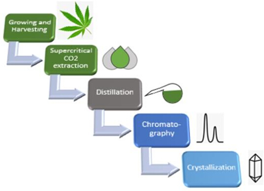 在大麻二酚(CBD)的生產(chǎn)中,THC及其它植物性雜質(zhì)(如蠟質(zhì)和色素)很難去除,需要經(jīng)過一系列的預(yù)處理和純化步驟,才能從大麻中提取獲得高純度、低THC含量的CBD產(chǎn)品。
