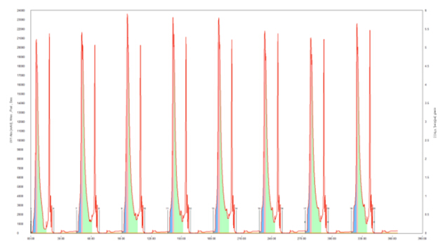 圖9各cycle重疊性良好,表明MCSGP功能運(yùn)行穩(wěn)定,各cycle的產(chǎn)率、產(chǎn)品濃度及純度均保持穩(wěn)定。保留時(shí)間和峰形的變化由MControl自動(dòng)補(bǔ)償,MControl根據(jù)紫外線閾值啟動(dòng)CBD收集,當(dāng)紫外值降低至最大峰值90%時(shí)結(jié)束收集。
