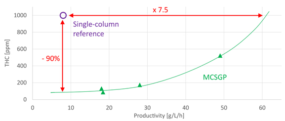 MCSGP可用于不同工藝要求。如果對(duì)目標(biāo)產(chǎn)品的純度要求并不高,采用MCSGP可使產(chǎn)率進(jìn)一步提高。比如某企業(yè)要求THC含量上限為1000 ppm時(shí),收率水平不得低于85%,用MCSGP代替單柱層析后,產(chǎn)率由原來的8 g/L/h提高到了60 g/L/h以上。而另一工藝情況為,當(dāng)從單柱層析轉(zhuǎn)換為MCSGP時(shí),保持產(chǎn)率不變,雜質(zhì)THC含量可從1000 ppm降低至100 ppm。見圖12純度 - 產(chǎn)率曲線。