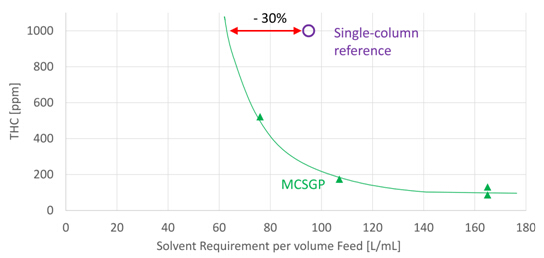 圖13顯示了單柱層析和MCSGP的溶劑消耗對(duì)比。在要求THC最大含量為1000 ppm時(shí),MCSGP可使溶劑消耗量降低30%。單柱層析的溶劑消耗量為每mL上樣樣品消耗95 mL溶劑,而MCSGP的溶劑消耗量僅為每mL上樣樣品消耗65 mL溶劑。